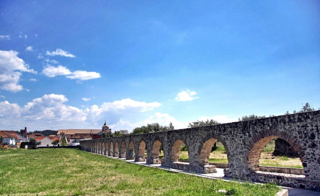 Aqueduto percorrendo uma extensão de 350 m., composto por 35 arcos de volta perfeita, em alvenaria de pedra, com aduelas em tijolo, suportado por pegões de planta quadrangular. O troço de 28 arcos visível nos terrenos agrícolas tem estrutura sustentando os canos, protegidos por paredes de alvenaria argamassada, com cobertura em meia cana; o troço final, de 7 arcos, atravessa a vila e encontra-se integrado na estrutura dos edifícios, apresentando paramentos rebocados e pintados terminando no convento sobre um arco.